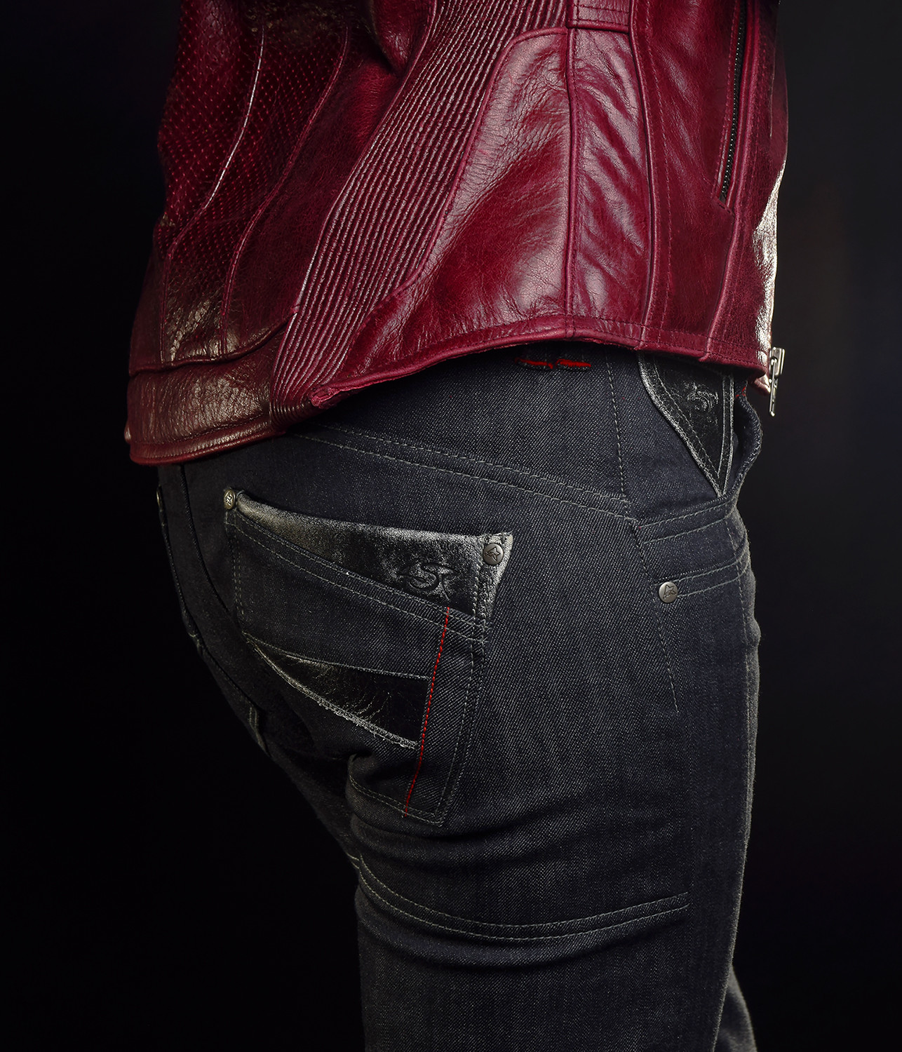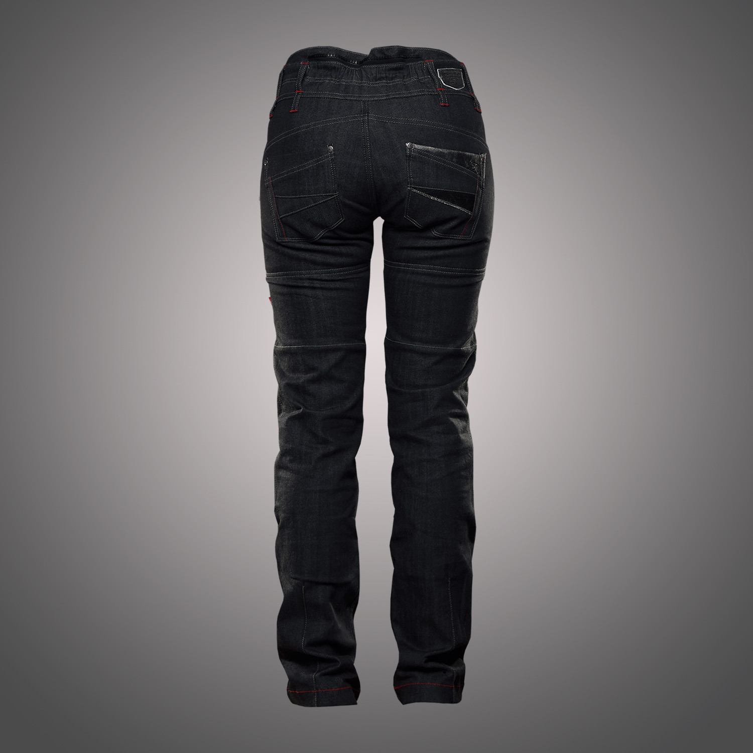 Die Damen Cool Lady Black Jeans ist eine Motorradhose aus 14 Unzen Denim, im Knien- und Gesäßbereich Faser DuPont™ Kevlar®-verstärkt. Unsere Knieprotektoren in den Motorradjeans sind mit einem einzigartigen System fixiert. Es ist eine Art elastischer Strumpf, der die Protektoren unabhängig vom Jeansstoff auf dem Knie und Schienbein fixiert. Die Protektoren sitzen so immer an der richtigen Stelle. Als einziger Hersteller können wir die Knieprotektoren verstellen.