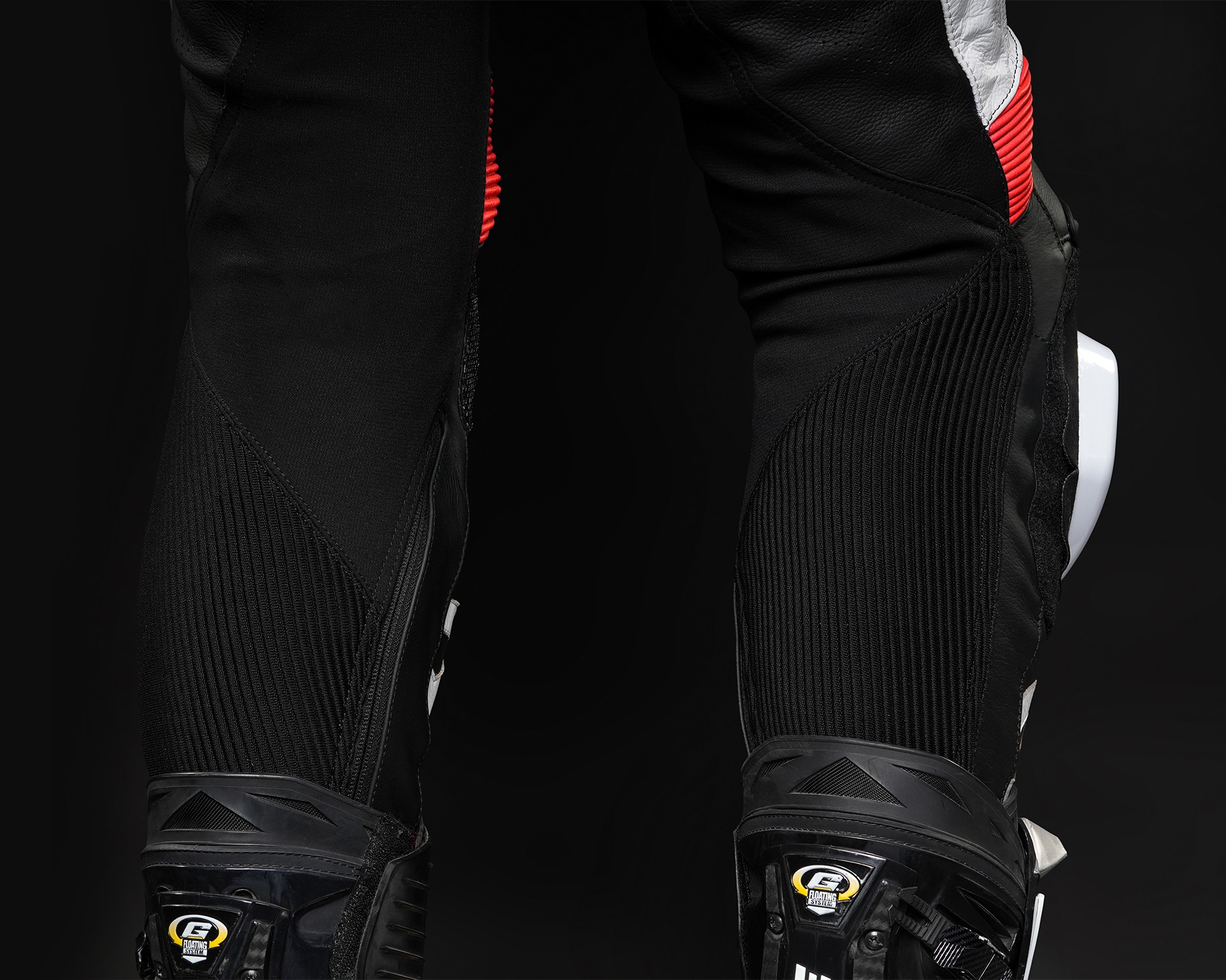- flexible Lederpaneele über den Knien und im Lendenbereich für bessere Beweglichkeit auf dem Motorrad